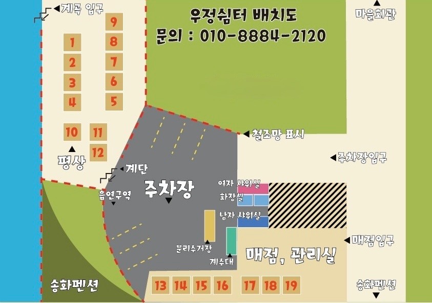 계곡과 함께하는 힐링 쉼터 푸른 숲과 시원한 물소리, 정성 가득한 한 끼 우정쉼터에서 특별한 하루를 보내세요! W E L C O M E 우정쉼터에 오신 것을 환영합니다. INFORMATION 우정쉼터 배치도 안내 평상구역 우정쉼터에는 총 19개의 평상이 마련되어 있습니다. 1번 ~ 12번 계곡 입구 쪽, 계곡과 가장 가까운 위치 13번 ~ 19번 매점, 주차장과 가까운 위치, 이동이 편리함 주차안내 넓은 전용 주차장이 마련되어 있어차량 이용 시에도 편리하게 방문하실 수 있습니다. 흡연은 주차장 왼쪽 구역의 흡연 지정 장소에서만 가능합니다. 편의시설 물놀이 후 바로 샤워하실 수 있도록 남녀 샤워실과 화장실, 계수대가 있어 이용이 편리합니다. 샤워실에는 샴푸, 바디샤워가 구비되어 있습니다. 매점 & 관리실 간단한 물품은 매점에서 구매하실 수 있으며, 평상 배정, 문의 사항 등을 친절히 안내해 드립니다. 분리수거 쉼터 내에는 분리수거장이 마련되어 있습니다. 쓰레기 분리 배출을 꼭 지켜주세요. 주변 정보 쉼터 인근에는 우인펜션, 송화펜션 등이 있어 숙박과 함께 여유로운 하루를 보내시기에 좋습니다. 단체 모임 OK, 가족 나들이도 OK! 시원한 계곡에서 뛰놀고, 넉넉한 평상에서 쉬어가세요. 예약문의 010-8884-2120 directions 우정쉼터로 오시는 길을 안내해드립니다. Add. 충북 괴산군 칠성면 쌍곡로1길 38 (쌍곡1교차로에서 '장연, 태성리, 쌍곡계곡방면으로 들어오셔서 쌍곡로1길 방면으로 들어와 자동차로 5분거리) phone. 010-8884-2120 Tel. 043-832-0119 예약문의. 010-8884-2120 대표자. 우정옥 주소. 충북 괴산군 칠성면 쌍곡로 1길 38 입금계좌. 농협 301-0054-3178-91 (예금주 : 우정옥)